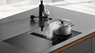 Der Deckel für Töpfe und Pfanne leitet Kochdünste direkt auf die Absaugung in der Mitte des Kochfeldes. Das neue Kochgeschirr von Miele ist hochwertig und langlebig. (Foto: Miele)