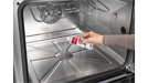 Ein eigens von Miele entwickelter Flüssigreiniger wird in das Sieb am Geräteboden eingefüllt, sodann automatisch mit frischem Wasser vermischt, zur Garraumdecke gepumpt und von dort über ein Flügelrad im Garraum gleichmäßig versprüht. (Foto: Miele) |