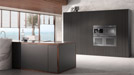 Maximal reduziert: Miele-Einbaugeräte im grifflosen ArtLine-Design, hier in Kubusform angeordnet und in der Farbe Graphitgrau. |