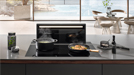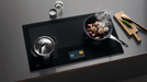 Ebenfalls ausgezeichnet ist das Induktionskochfeld KM 7999 FL. Das großformatige Kochfeld bietet flexiblen Raum für bis zu fünf Kochgeschirre und wird über ein multifunktionales und mehrfarbiges Touch-Display bedient. Mittig im vorderen Bereich in die Glaskeramik eingelassen, werden darauf Leistungsstufen, Temperaturen oder Garzeiten für die einzelnen Kochzonen intuitiv per Fingertipp ganz einfach angewählt. Wird Kochgeschirr aufgestellt, erscheint für Topf oder Pfanne eine farbige Fläche an der entsprechenden Stelle im Touch-Display. Insgesamt acht TempControl-Sensoren sorgen für perfekte Ergebnisse beim Braten. Diese Infrarotsensoren unter der Glasoberfläche regulieren die Temperatur zwischen 140 und 230 Grad Celsius exakt und erübrigen das manuelle Nachjustieren der Leistungsstufen. Damit gehören angebrannte Speisen der Vergangenheit an. Spezielles Zubehör ist für diese Funktion nicht erforderlich, das verwendete Kochgeschirr muss dazu lediglich induktionstauglich sein. Selbstverständlich ist das Induktionskochfeld per WLAN vernetzungsfähig und kann in die Miele App integriert werden. Für ein stets angenehmes Raumklima kommuniziert das Kochfeld mit der bewährten Funktion Con@ctivity.