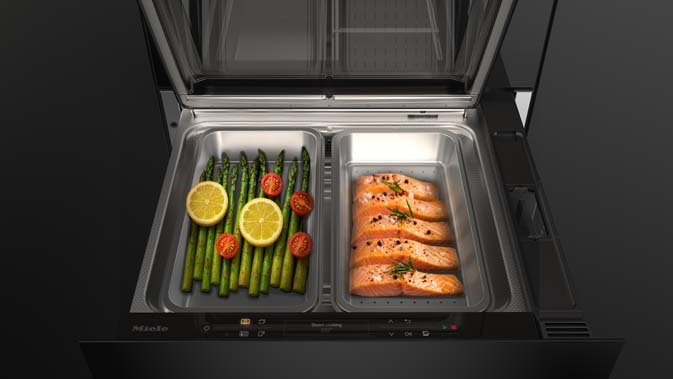 Weltpremiere: Die neue Dampfgarschublade von Miele – Platzsparende 3-in-1-Lösung zum Backen, Aufwärmen und Dampfgaren. Mit zwei getrennten Garräumen zur parallelen Zubereitung unterschiedlicher Lebensmittel. (Foto: Miele) |