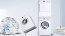 Werden Waschmaschine und Trockner zu einer Wasch-Trocken-Säule aufeinander gestellt, ist modernste Wäschepflege auf nur einem halben Quadratmeter Platz möglich – und das in kurzer Zeit. Das Buntwäscheprogramm 60°C ist nach 59 Minuten beendet, die Trocknung im Programm „Schranktrocken“ dauert etwa 36 Minuten (Ablufttrockner). Nach etwa eineinhalb Stunden steht die gesamte Wäsche wieder zur Verfügung. Dabei ermöglichen Waschmaschine und Trockner effiziente Verfahrensabläufe: So kontrolliert ein Volumenzähler den exakten Wassereinlauf und hilft dadurch, Wasser zu sparen. Das Wasserniveau bestimmen Drucksensoren in Abhängigkeit von der Wäschemenge. Beim Waschen und Trocknen werden die Textilien geschont, denn alle Geräte sind mit der Miele Schontrommel ausgestattet.
