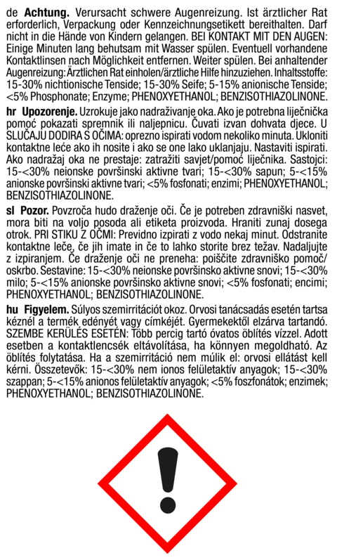 Achtung. Verursacht schwere Augenreizung. Ist ärztlicher Rat erforderlich, Verpackung oder Kennzeichnungsetikett bereithalten. Darf nicht in die Hände von Kindern gelangen. BEI KONTAKT MIT DEN AUGEN: Einige Minuten lang behutsam mit Wasser spülen. Eventuell vorhandene Kontaktlinsen nach Möglichkeit entfernen. Weiter spülen. Bei anhaltender Augenreizung: Ärztlichen Rat einholen/ärztliche Hilfe hinzuziehen.