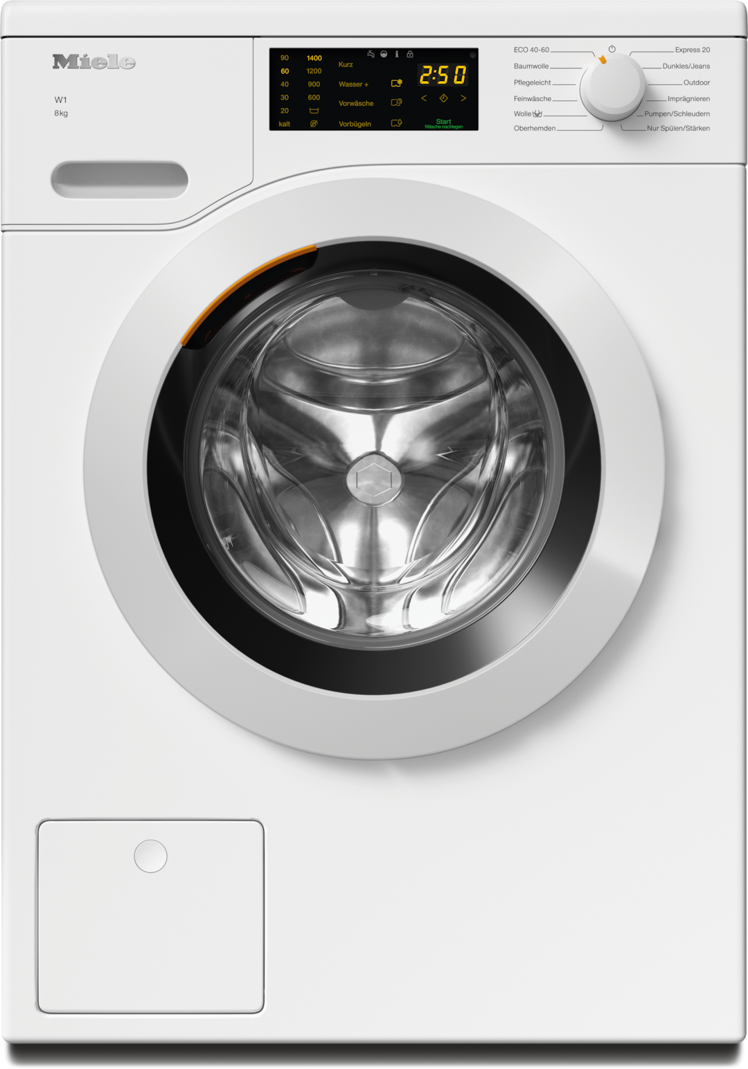 - 4.Während der Entwicklungsphase der Waschmaschinenserie W1 / W2 hat Miele Modelle & Kernkomponenten mit 5000 Waschgängen (= 5 Wäschen p. Woche für 50 Wochen p.a.) in div. Programmen getestet. Mehr: miele.com/20years