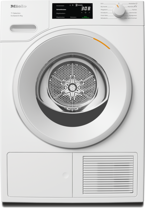 - 6.Zeitersparnis berechnet im Vergleich zu Miele Trocknern ohne EcoSpeed bei gleicher Beladungsmenge und vergleichbarer Energieeffizienz. Getestet im Programm "Baumwolle" bei voller Beladungsmenge.