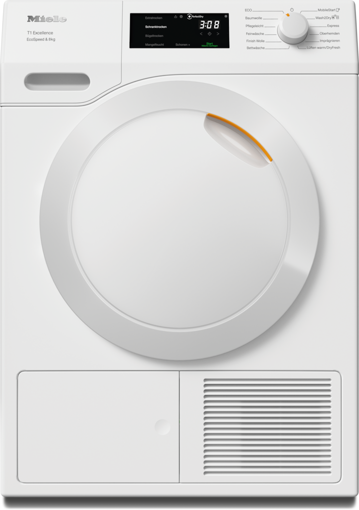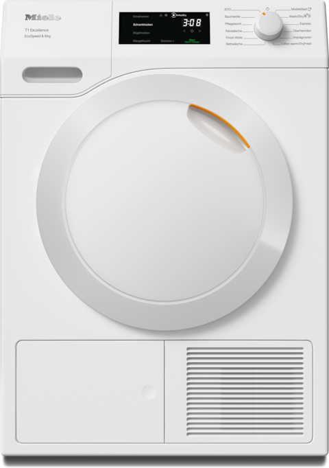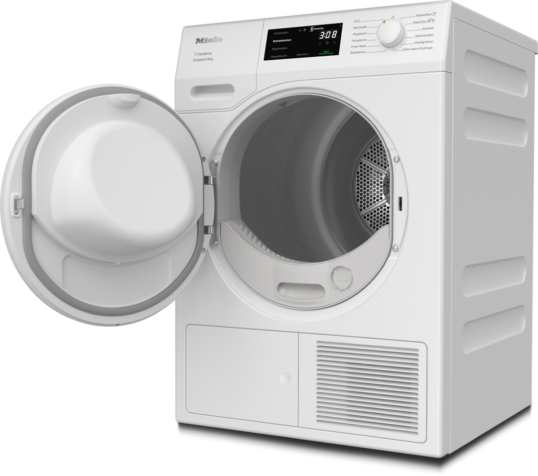 - 6.Zeitersparnis berechnet im Vergleich zu Miele Trocknern ohne EcoSpeed bei gleicher Beladungsmenge und vergleichbarer Energieeffizienz. Getestet im Programm "Baumwolle" bei voller Beladungsmenge.
